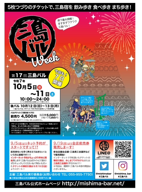 10月5日(日)~11日(土)まで、毎年恒例の「三島バル」が開催されます。